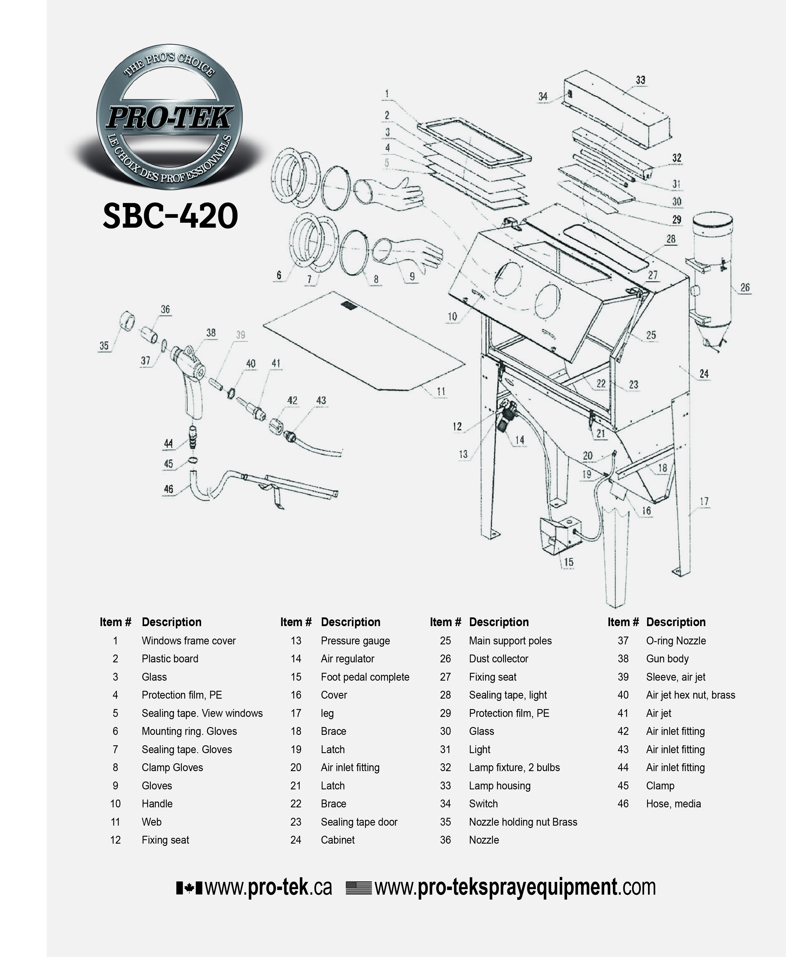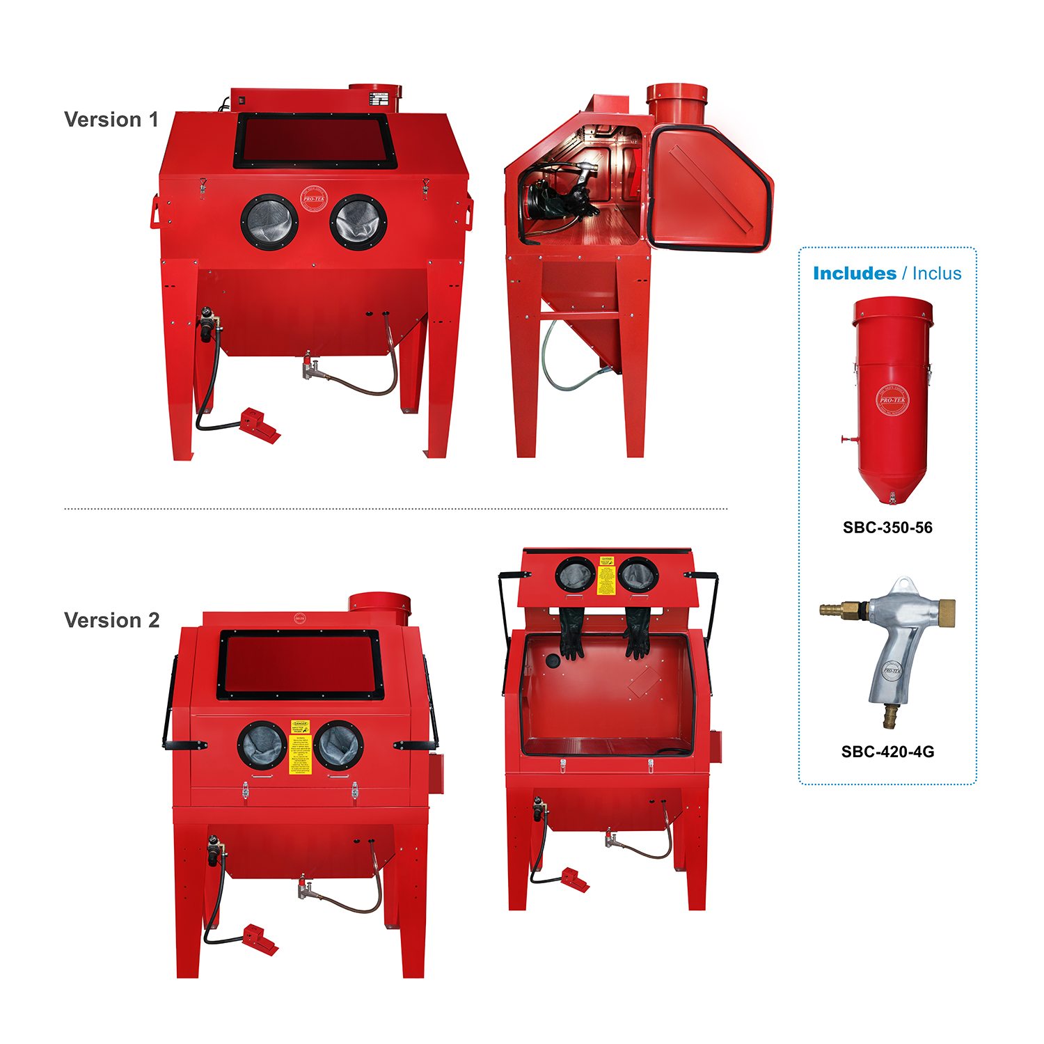 Heavy duty sandblasting cabinet. Designed and engineered for high efficiency parts finishing. Internal fluorescent light, opening side door, rubber gloves and ceramic nozzles, 0.6 and 0.7 mm with air operated foot pedals. Vacuum included. (68" x 52" x 24,4")
